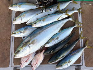 | M様御一行チャーター便で青物ジギング:鯛ラバ=7:3で狙いました! 幹事様以外ビギナーの方が殆どなので・・・それぞれレクチャーさせて頂いてから・・・GO! 前半戦青物ジギング・・・湾口方面で100/120g使用のバーチカルストロングスタイルで狙い! イナダのボイルエリア発見!で・・・寄せて・・・幹事さんには・・・やってて頂き・・・即ヒット!・・・(・o・) ”釣るなら今でしょ!”で・・・レクチャーも・・・ほどほどに!?・・・実戦突入!・・・(^^;)・・・で・・・皆さんゲット! タックルの扱いにも慣れた所で・・・サイズUP狙って・・・転戦!・・・すると・・・紅一点!にビックヒット!で・・・ お仲間のヤンヤの声援の中!・・・頑張ってファイト!・・・お見事80UPの6キロ小ブリをゲット!で・・・!(^^)! 潮止まり時から・・・終盤戦鯛ラバもやってみたいとの事で狙ってみましたが・・・潮流れは・・・イマイチ・・・(-_-;) そんでも・・・短時間でしたが・・・本命2枚型見る事が出来ました!・・・(^^) 幹事のM様・参加の皆さん!・・・お疲れ様でした。また機会作って・・・御来船下さい。お待ちしてます。 ![]() ![]() ![]() ![]() ![]() |
