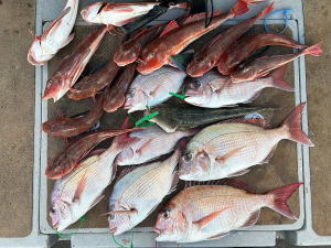 | Y様御一行チャーター便にて烏賊:鯛ラバ=8:2で狙いました! 烏賊ほぼ初挑戦との事で・・・胴付き仕掛けでモンゴウ狙ってみましたが・・・8ヒットの5杯! モンゴウ烏賊(”デンジャラスボム!?”)の取り扱い慣れていないと言う事で・・・写真は無し。(^^;) 上げ潮のこりの最後に潮止まりまで鯛ラバ狙って見ましたが・・残念ながらカサゴ・サバフグで・・・本命型見ず。 御予約時にお知らせさせている・・・タックル例・ルアー・仕掛けは実績の出ている物をお知らせしております。 近々で釣れている物なので・・・是非参考にして・・・ご準備下さい。・・・宜しくお願い致します。・・・m(_ _)m |