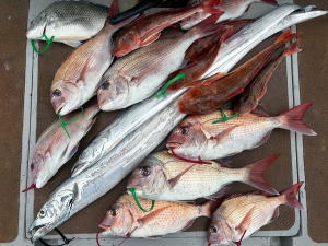 | 曇天凪の海を…久々御来船のM様御一行チャーター便にて出船! 青物ご希望でしたが…ここの所芳しくない感じなので…ご相談でメインで太刀魚・サバ狙いに変更… 青物タックル流用の急造タックル&ルアーで狙って頂き…太刀の棚は10m以浅で…なかなか手強い感じで… ワインド等…有効な状況でしたが…手持ちのジグで…太刀・サバ混じりで…それぞれ10匹ちょい/お一人! で…お土産は確保出来ました! 前半戦&後半戦…鯛ラバで狙いましたが…クラゲちゃんキツい感じで…千切っては投げ×2!頑張ってくれて… ナントカカントカ!?…本命の型見れて…太刀・サバ追釣で終了。 幹事のM様…参加の皆様…有り難う御座いました。…また機会作って…宜しくお願い致します。m(_ _)m  |
