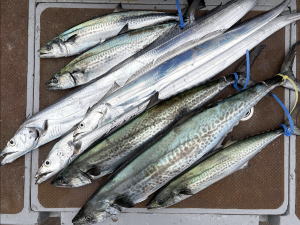 | K様御一行にてサワラ狙いで出船! 殆ど初チャレンジの方で頑張って巻き巻きして頂きましたが・・・なかなか良い所探せして差し上げられず・・・ 本命惜しいバレも続いてしまい・・・サゴシ兄さん~サゴシ3本・他太刀魚・・・ゲットで終了。 参加の皆さん・・・頑張ってやってくれていたので・・・もう少し何とかしたかったのですが・・・スンマセン。 また機会作って・・・皆さんで御来船下さい。・・・お待ちしております。・・・m(_ _)m   PS 秋らしくなりましたね!・・・”秋の気持ち良いシーズン!”・・・遊びに来て下さいねぇ~! 10月平日のみ空き!・11・12月土日祝ご予定の方・・・お早めの御予約を・・・お願い致します。・・・m(_ _)m |
